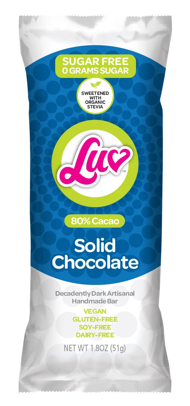 80% cocoa sugar-free bean-to-bar LUV chocolate in a variety of flavors. We sweeten our chocolate with our own proprietary organic stevia blend called Sweet LUV™ which is also available for purchase.