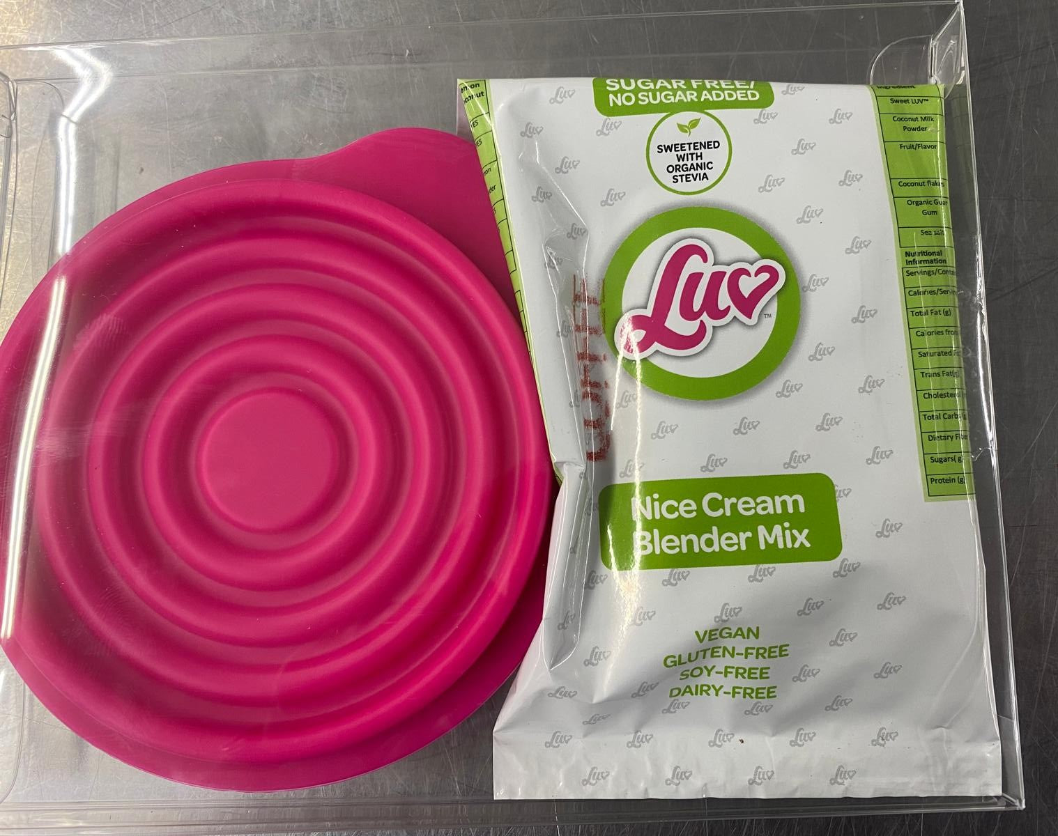 Make LUV nice cream in your own home! Dissolve one cup of hot water with the contents of the Blender Mix package and whip it up in your home blender till frothy. Pour the mix into the container provided in the Blender Mix Kit and freeze overnight. It’s so easy! Perfect for folks living where LUV Nice Cream pints are not available in the grocery store.