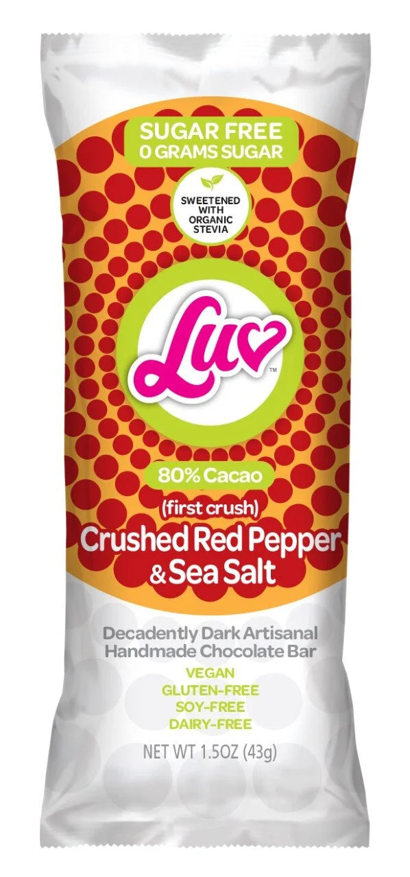 80% Cocoa, Zero Sugar, Chocolate Bar with crushed red peppers and sea salt.