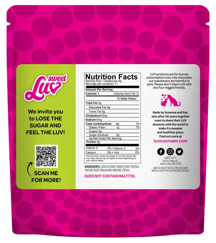 Best tasting all-natural sugar alternative on the market. Our Sweet LUV is a unique blend of organic stevia, chicory root inulin and plant-derived polyols. Tastes, bakes, and sweetens your life just like sugar. We use it to make our ice creams, chocolates and all the baked goods. YUM!